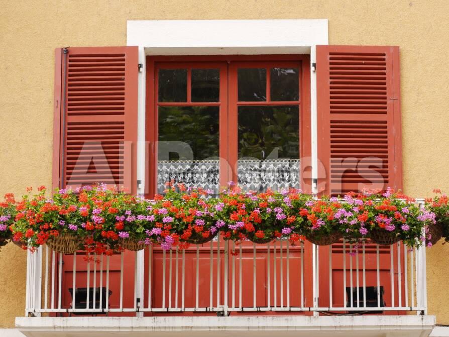 Pots Of Geranium Flowers On Window Balcony Photographic Print By