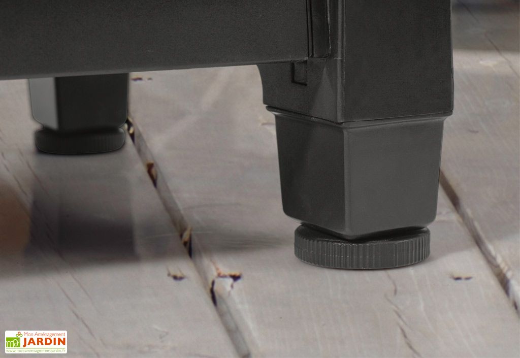Desserte de jardin en resine et plateau inox 2 portes. Manette sur le cote garnis de mousse et mousse recyclee 85 x 93 x 100 cm hauteur dassise. Fauteuil relax buckingham noir. Banc bar et desserte de jardin.